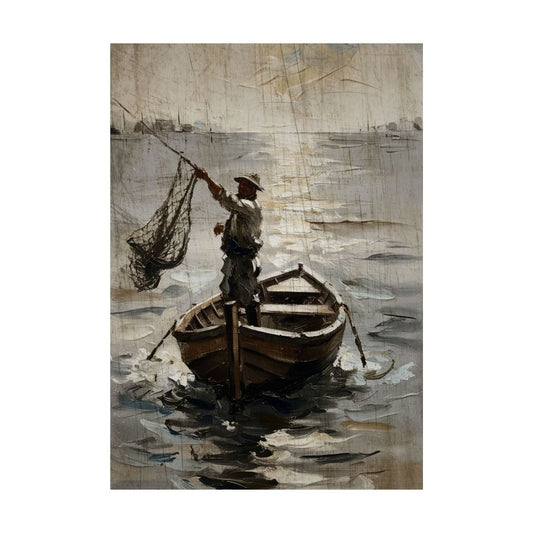 The Day's Net — An Impressionistic textured realism of a solitary fisherman. Wall art canvas