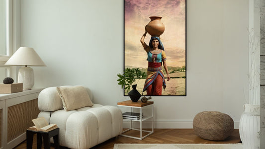 Daughter of the Nile — A contemporary vintage art of a woman holding a clay pot. Wall art canvas framed