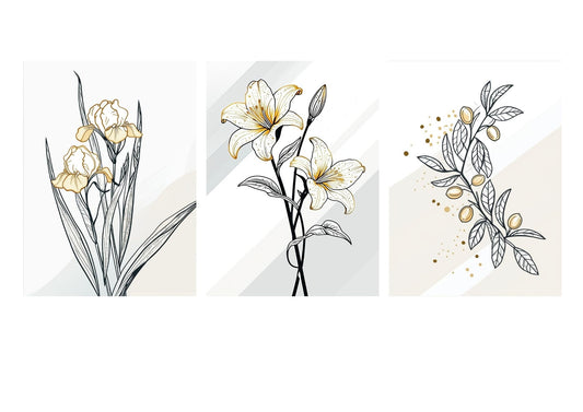 Trio — A triptych featuring minimalist line art drawings of various florals and botanicals. Canvas wall art